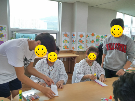 각자 도안에 색칠하고 자원봉사자들과 색종이를 접고 순서대로 진행