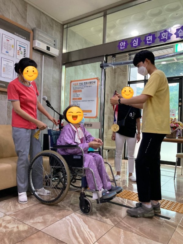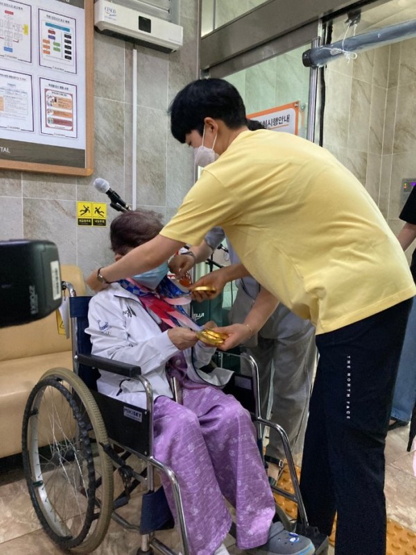 외할머니께는 손녀딸이 방문한다는 소식을 듣고 하루종일 기다리시다 손녀딸을 만나자 수고했다며 손을 어루만져 주셨어요. 안산선수는 할머니께 3개의 금메달을 손수 걸어드렸고 안산선수가 외할머니께 직접 사인한 용지와 꽃바구니를 선물하며 기쁨을 함께 나누었습니다. 자랑스러운 안산선수의 방문으로 외할머니께서는 기쁨 가득한 시간이 되었답니다.