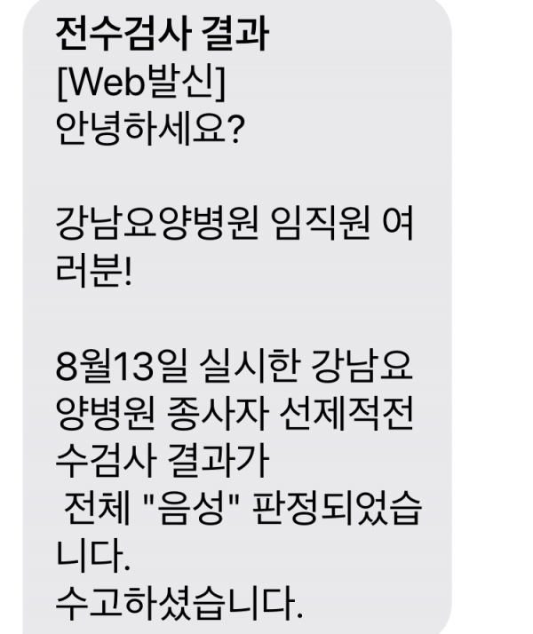 8월13일 코로나 PCR검사 전원 "음성" 페이지 정보 작성자 사회복지사 작성일21-08-24 11:17 이전글 다음글 목록 본문 돌파감염으로 요양시설 집단감염이 확산되면서 감염취약시설에 대한 주기적 선제검사를 한시적으로 2차 접종 완료종사자는 2주 1회, 미접종 및 1차 접종 종사자는 1주 1회 검사를 시행하게 되었습니다. 8월 13일 강남요양병원 종사자 전원 코로나 pcr검사 결과 "전원음성" 판정 되었습니다. 이전글 다음글 목록