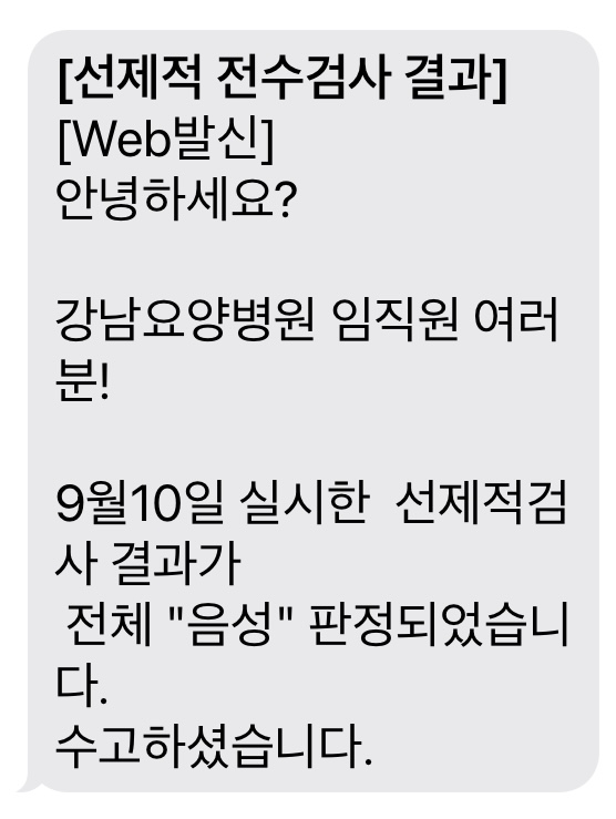 강남요양병원은 9월 10일 실시한 코로나 19 선제적 검사결과 전체 "음성" 판정 되었습니다.